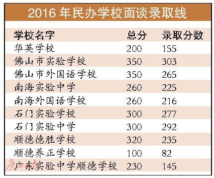 廣州日?qǐng)?bào)訊 (文/表 記者陳昕宇)昨日,佛山各校小升初面談錄取分?jǐn)?shù)線正式公布。記者獲悉,今年華英學(xué)校的錄取分?jǐn)?shù)為155分,南海實(shí)驗(yàn)中學(xué)為225分。有家長反饋,盡管官方公布的放榜時(shí)間是昨日,但在放榜前一晚就有家長接到學(xué)校的“報(bào)喜短信”或者電話。雖然大多數(shù)民校表示不會(huì)進(jìn)行補(bǔ)錄,但也有個(gè)別民校稱如果有剩余學(xué)位會(huì)電話通知家長。