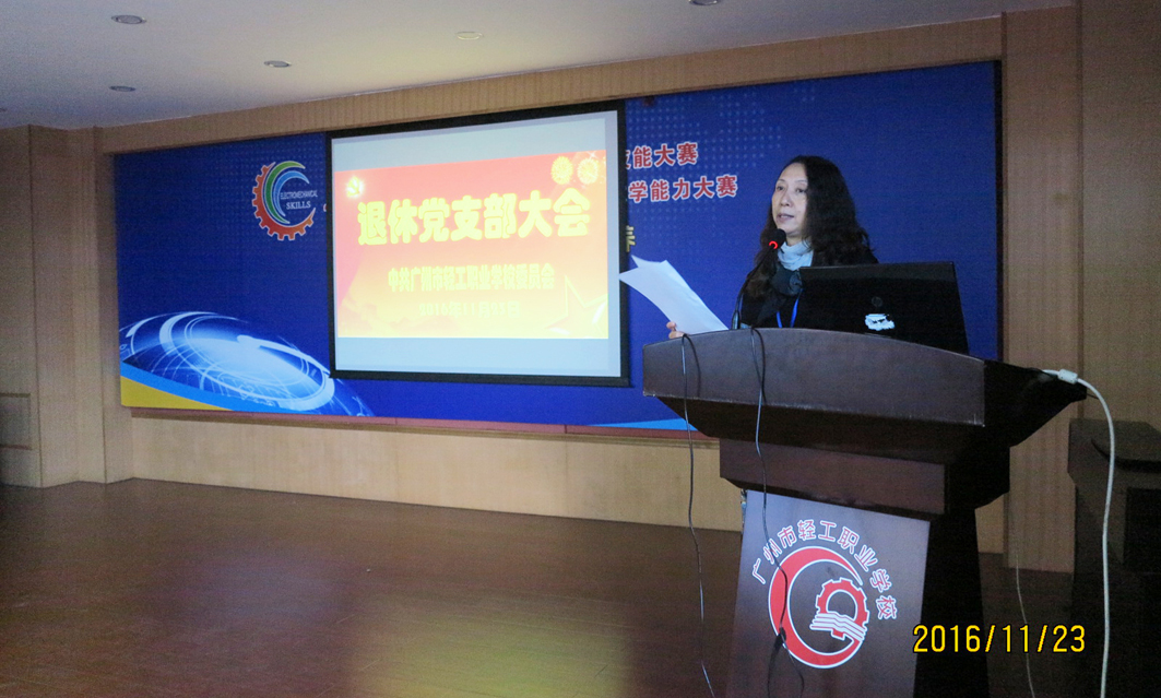 為響應(yīng)教育局黨委要求,進(jìn)一步加強(qiáng)學(xué)校黨建工作,2016年11月23日,廣州市輕工職業(yè)學(xué)校離退休黨支部在天河校區(qū)教工活動(dòng)室順利召開黨員大會(huì)。會(huì)議由學(xué)校黨委書記胡學(xué)蘭主持。