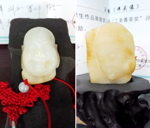 15級玉雕專業(yè)盧曦瑩的《笑佛頭像》、15級玉雕專業(yè)劉自學(xué)的《佛頭像》獲得銅獎;