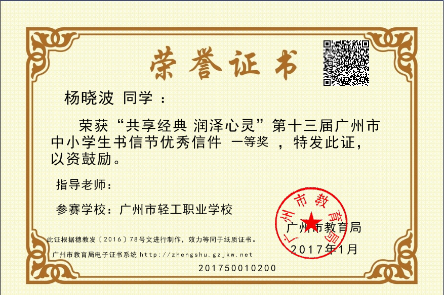 為深入踐行和培育社會(huì)主義核心價(jià)值觀,弘揚(yáng)優(yōu)秀傳統(tǒng)文化,引領(lǐng)廣大青少年學(xué)生樹立正確的人生觀和價(jià)值觀,市教育局、市郵政局以“共享經(jīng)典潤(rùn)澤心靈”為主題,共同舉辦了第十三屆廣州市中小學(xué)生書信節(jié)。