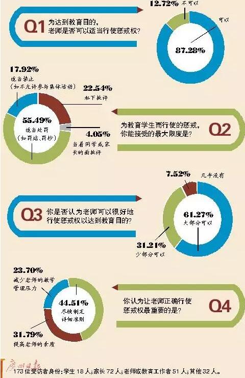 截至發(fā)稿時止,記者在回收的173份問卷中發(fā)現(xiàn),有87.28%的網(wǎng)友認(rèn)為,為達(dá)到教育目的,老師可以適當(dāng)行使懲戒權(quán),只有12.72%的受訪者認(rèn)為“不可以”。至于老師對懲戒尺度把握的能力,61.27%的受訪者認(rèn)為大部分老師可以很好地行使懲戒權(quán)以達(dá)到教育目的,31.21%的受訪者認(rèn)為只有少部分老師可以,7.52%的受訪者則悲觀地認(rèn)為幾乎沒有老師能夠很好地使用懲戒權(quán)。