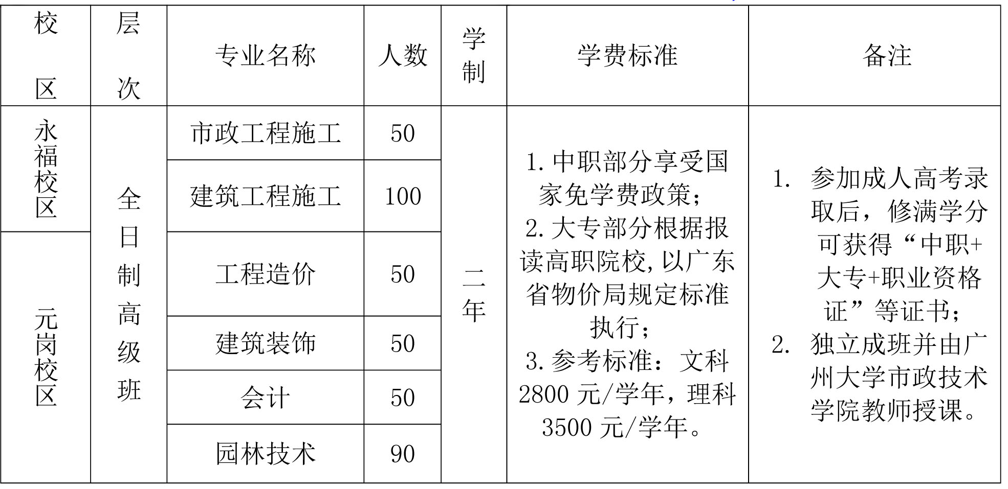 1. 高中起點高級三證班課程設(shè)置以專科院校教學大綱開設(shè),由廣州大學市政技術(shù)學院教師授課,畢業(yè)后可獲中職高級班畢業(yè)證書和大專畢業(yè)證書以及相關(guān)專業(yè)技能高級職業(yè)資格證書;