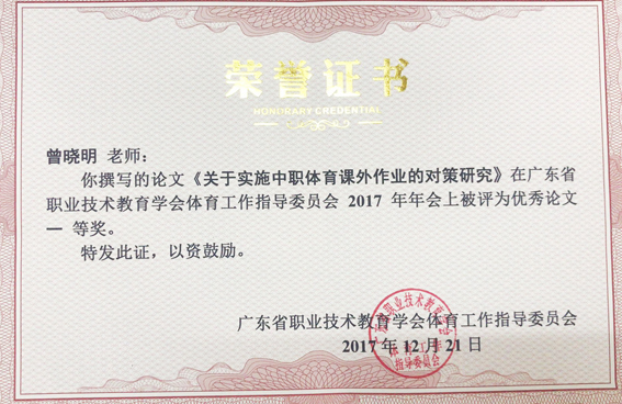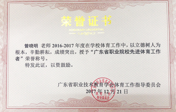 此外,曾曉明老師被授予2017年“廣東省職業(yè)院校先進(jìn)體育工作者”榮譽(yù)稱號(hào)。對(duì)他們所取得的成績(jī)表示衷心的祝賀!
