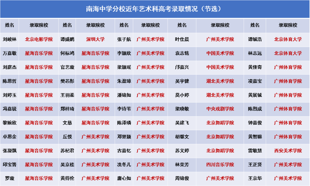 在2022年高考中,我校體藝生成績(jī)斐然。譚盛鵬同學(xué)被深圳大學(xué)錄取,黃佳奇被廣州體育學(xué)院錄取,張子航、葉仕晨等18人被廣州美術(shù)學(xué)院錄取,謝琪被四川美術(shù)學(xué)院錄取,張鳳珍等6人被星海音樂(lè)學(xué)院錄取劉峻林被北京電影學(xué)院錄取。三年砥礪,一鳴驚人!