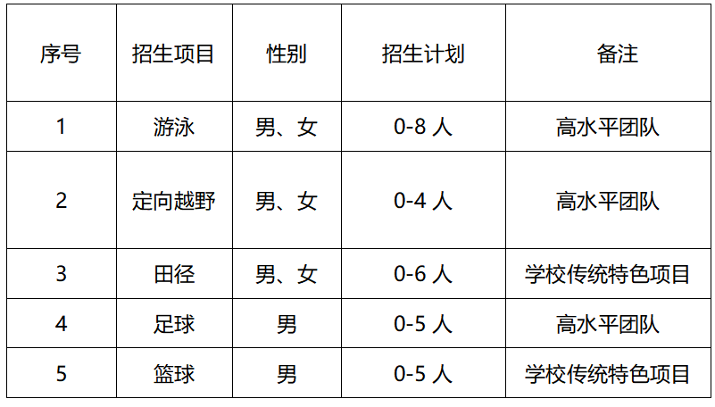 5、考生錄取入校后將組織進(jìn)行專項(xiàng)復(fù)試和體檢,對(duì)專項(xiàng)成績(jī)不達(dá)標(biāo)以及有隱瞞身心疾病不能正常參加訓(xùn)練和比賽的考生,將取消錄取資格。
